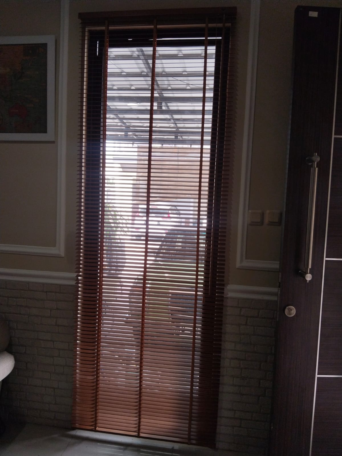 Wooden BlindWooden blind adalah tirai jendela yang terbuat dari bahan kayu berupa bilah-bilah horizontal (slat). Tirai jenis ini bisa dinaik-turunkan atau dimiringkan sudut bilahnya untuk mengatur cahaya dan privasi ruangan.Start Consultation Now Jenis-jenis Bahan Wooden Blind Materialkayu asli yang diolah Tampilanmemberi kesan natural, hangat, elegan dan mewah Fungsimengatur intensitas cahaya, menjaga privasi, sekaligus menambah nilai estetika interior. Kelebihan Bahan Wooden Blind Tahan lama, estetika tinggi, cocok untuk ruang tamu atau kantor bergaya elegan. Tahan terhadap panas dan memberikan kesan hangat alami pada ruangan. Mampu mengatur pencahayaan dengan baik, memberikan privasi optimal. Kekurangan Bahan Wooden Blind Lebih berat, harga relatif lebih mahal, kurang cocok untuk ruangan lembap (contoh di kamar mandi). Rentan melengkung atau rusak jika sering terkena kelembapan tinggi. Bobotnya lebih berat dibanding bahan lain, sehingga kurang cocok untuk jendela besar dengan bukaan tinggi. No Caption No Caption 1/1